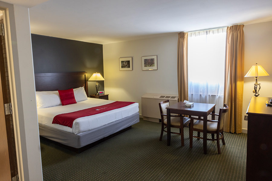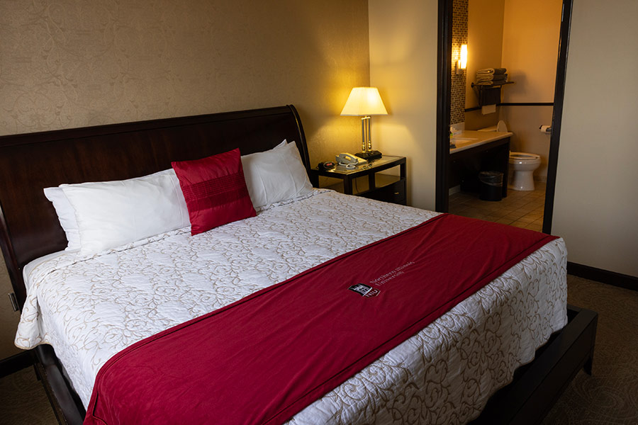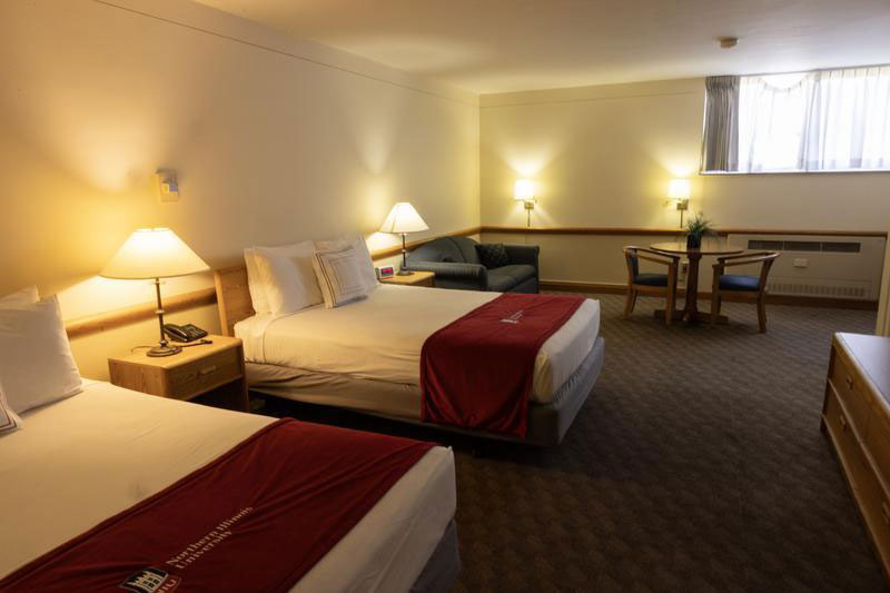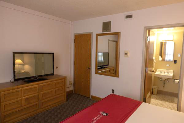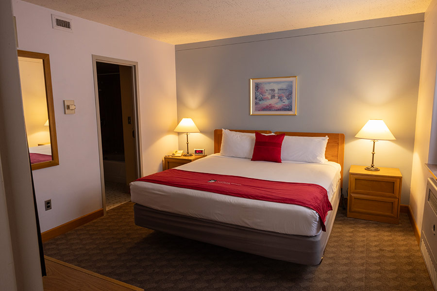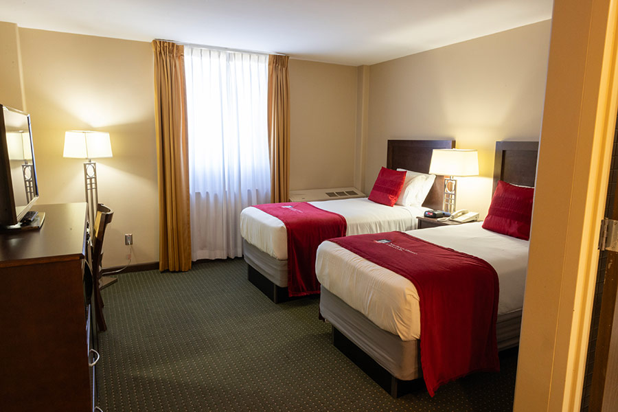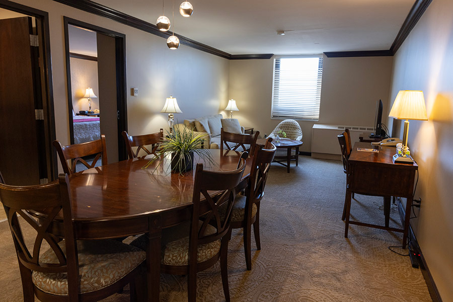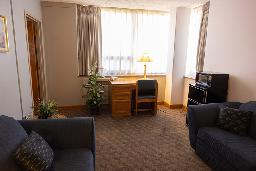 Features living room with corner window overlooking the Martin Luther King Commons. Includes sofa pull-out bed, desk, table with 2 chairs, 42" flat screen television and standard amenities. Bedroom area features one queen bed, 42" flat screen television, and accessible bathroom.
