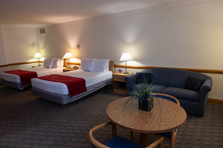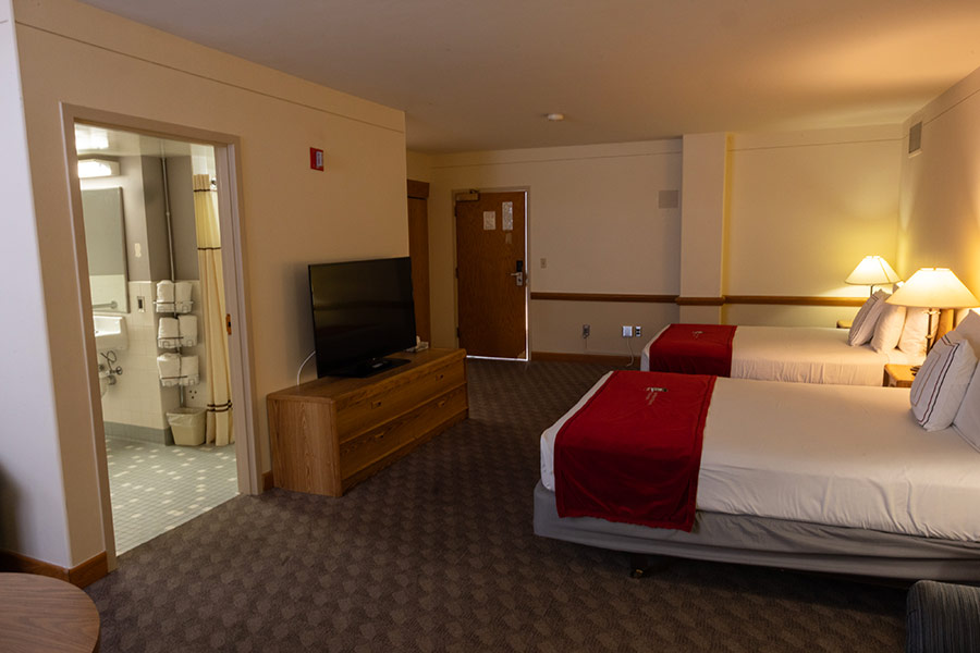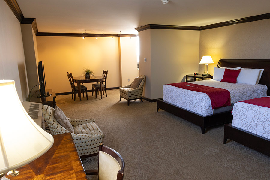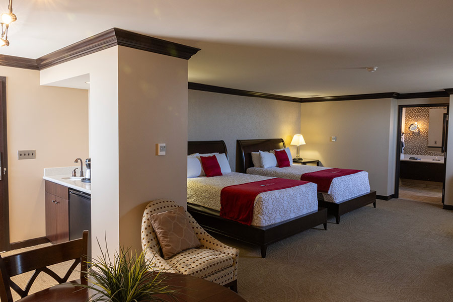 Features an open floor plan with plenty of space. It has two queen beds, a dining room table that seats four people, a wet bar with mini-refrigerator, desk and a bathroom.